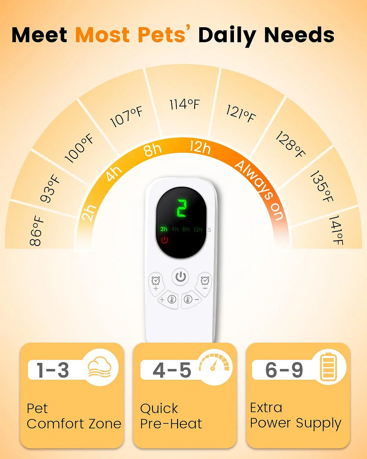 Adjustable heat and timer options: Tailor the experience to your pet's needs with multiple heat levels and timer modes, making it easy to match their daily habits.
