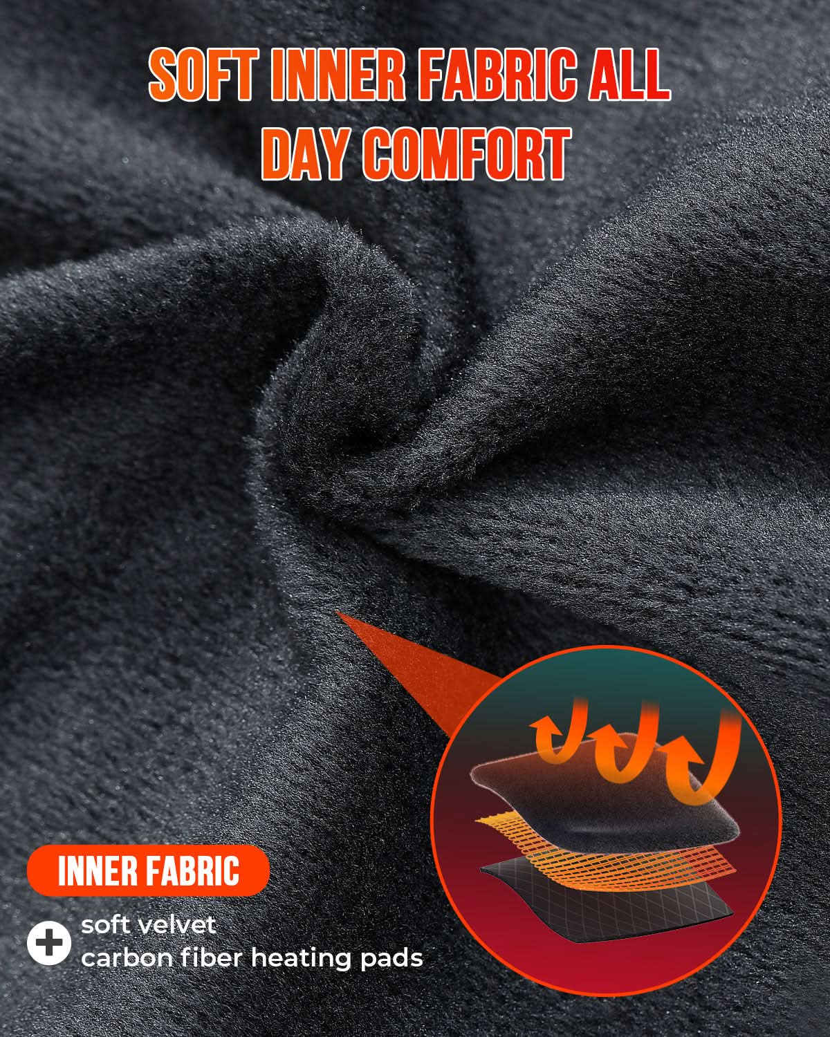 The Inner fabric of this heated vest is made of soft velvet and features carbon fiber heating pads. The combination of soft velvet and carbon fiber heating pads provides up to 12 hours of warmth and comfort