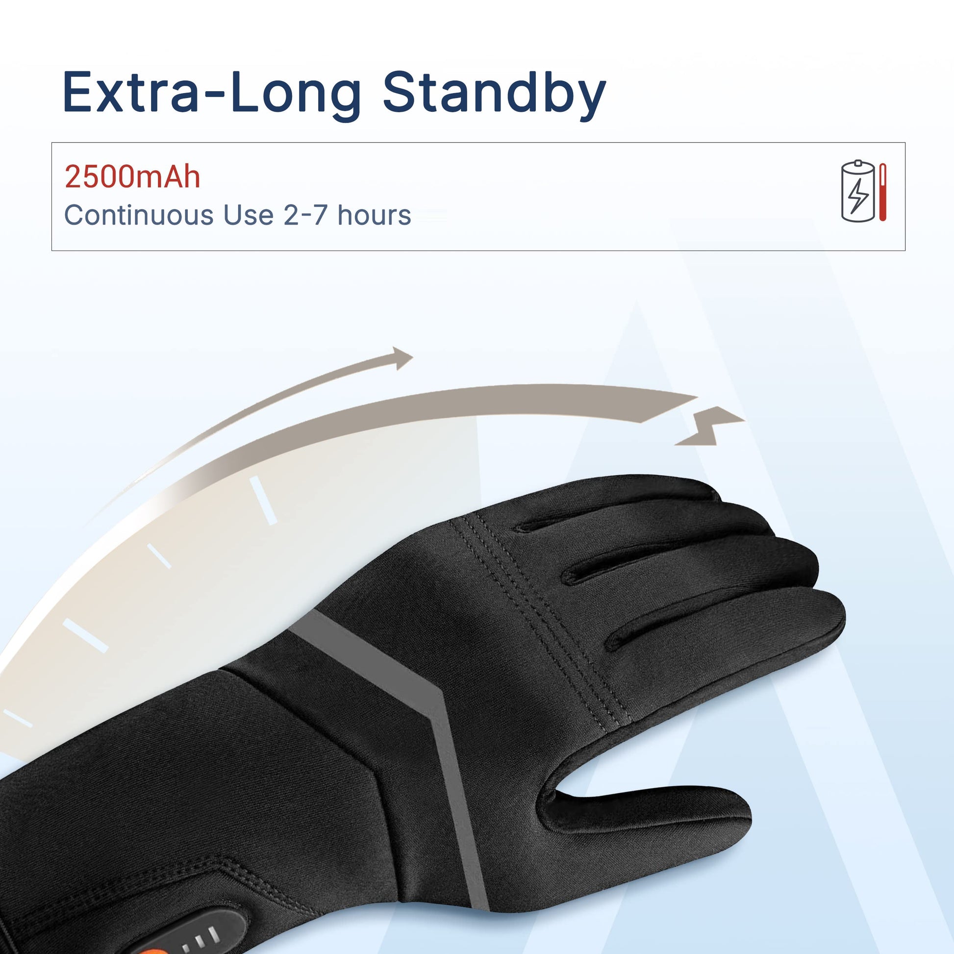 Rechargeable Battery with Adjustable Heat Levels: Powered by 7.4V 2500mAh lithium batteries, the gloves provide stable warmth for hours. Choose from three heat settings to match your environment, with simple one-button control and reliable low-temperature performance.