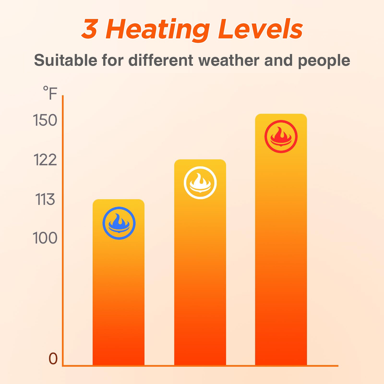 Adjustable Heat Levels with Power Indicator: Easily switch between three temperature modes — high, medium, and low — to match your comfort. LED battery indicators clearly show remaining power (100%, 75%, 50%, 25%), so you always know when to recharge.